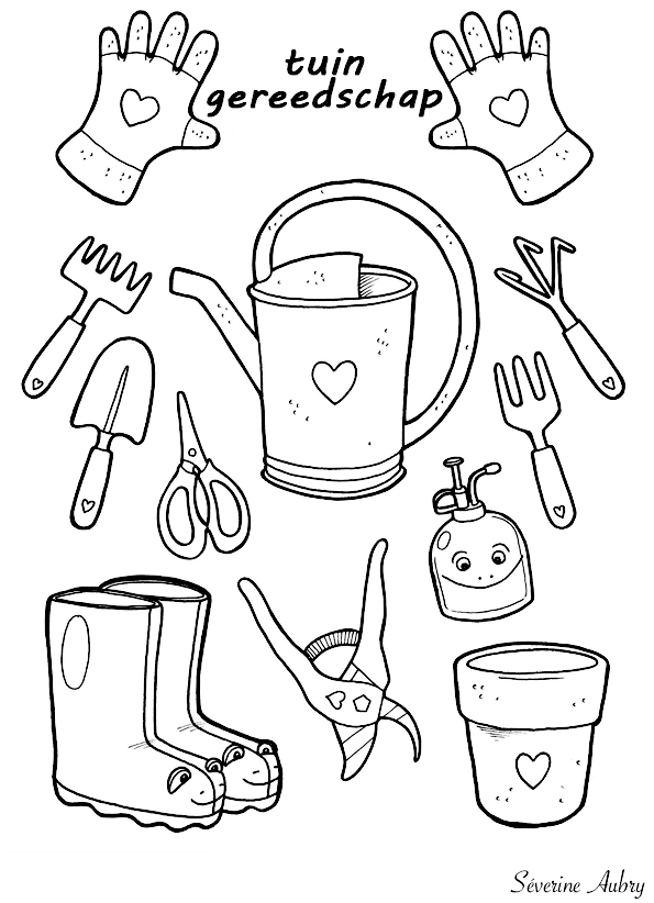 | Kleurplaat Titel | : Kleurplaat Gereedschap Tuingereedschap Lentebloemen |